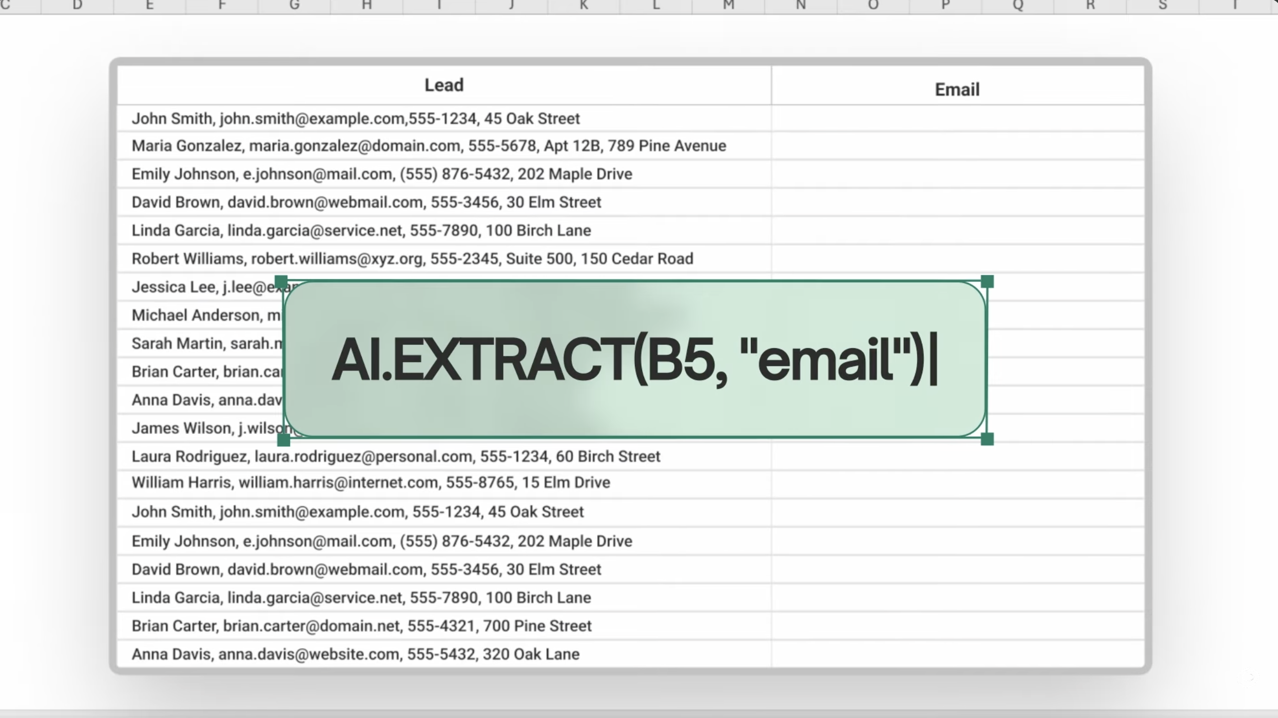 =AI.EXTRACT("연락처: kim@company.com / 전화번호: 010-1234-5678", "이메일")→ 결과: kim@company.com