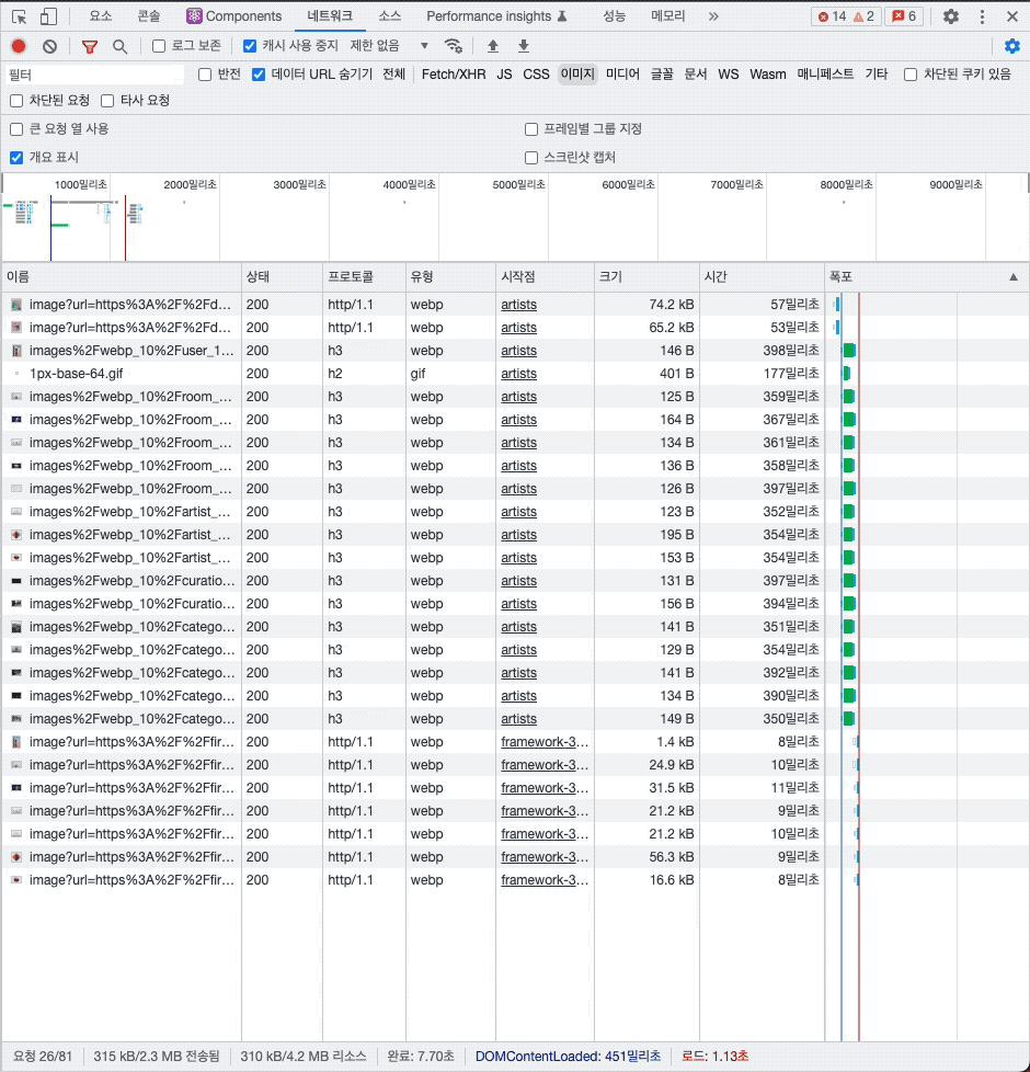 next image를 통해 webp로 변환되었고, 이미지의 용량(크기) 또한 최적화되었지만, 실제로 처리하여 화면에 그릴 때까지 캐싱되지 않은 상황이라면 약 25초가 걸리는 문제가 발생했다.
