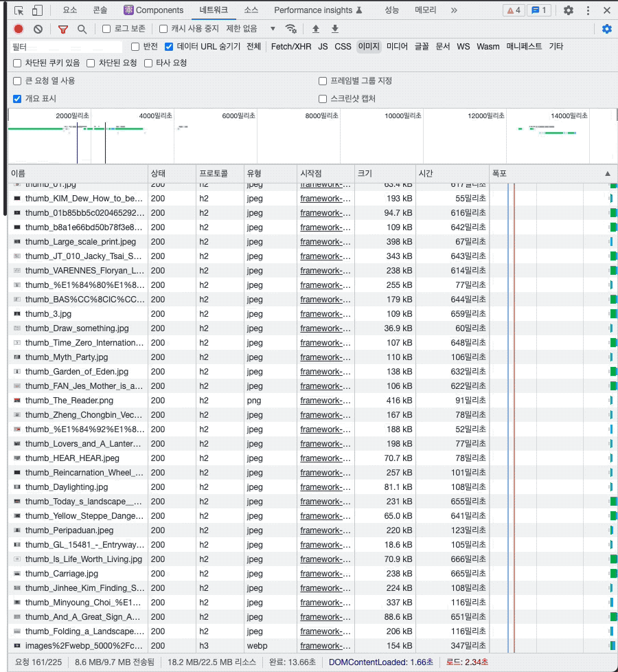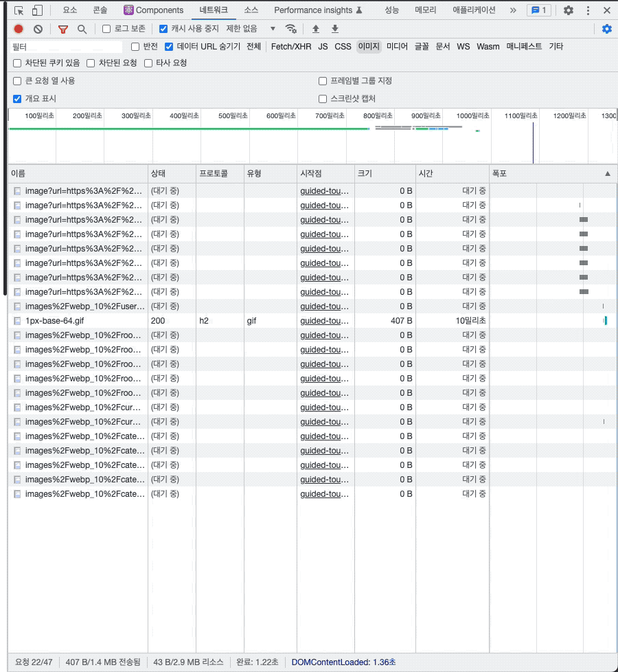이번에 발생한 문제는 next/Image를 통해 렌더링 하려는 이미지 리소스(20-40 개 또는 그 이상)가 많을 때, 이미지 리소스 자체의 크기는 줄었지만, 화면에 이미지를 정상적으로 제공할 때까지의 시간이 너무 오래 걸린다는 것이었습니다.